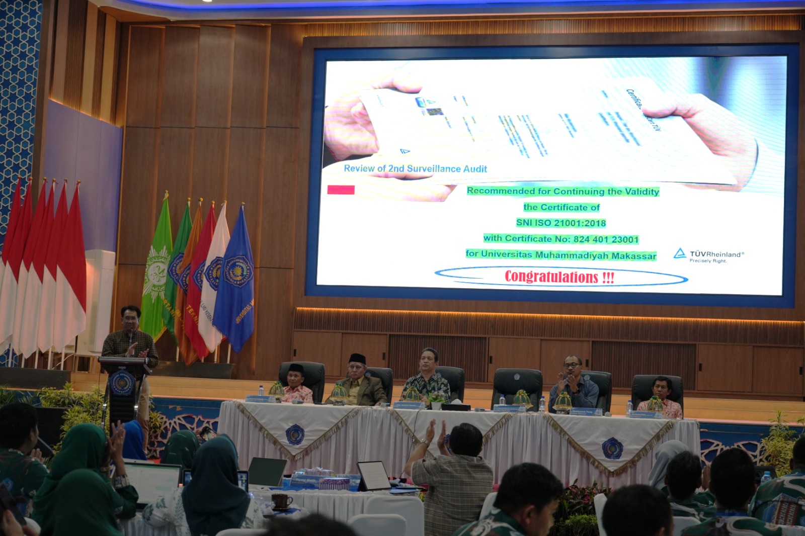 KHITTAH.CO, MAKASSAR – Universitas Muhammadiyah Makassar (Unismuh) berhasil mempertahankan sertifikat ISO 21001:2018 tanpa temuan major maupun minor. Hasil ini diumumkan pada penutupan Audit Eksternal Surveilans ISO yang digelar Selasa, 14 Oktober 2025, di Balai Sidang Muktamar 47, Kampus Unismuh Makassar, Jalan Sultan Alauddin.