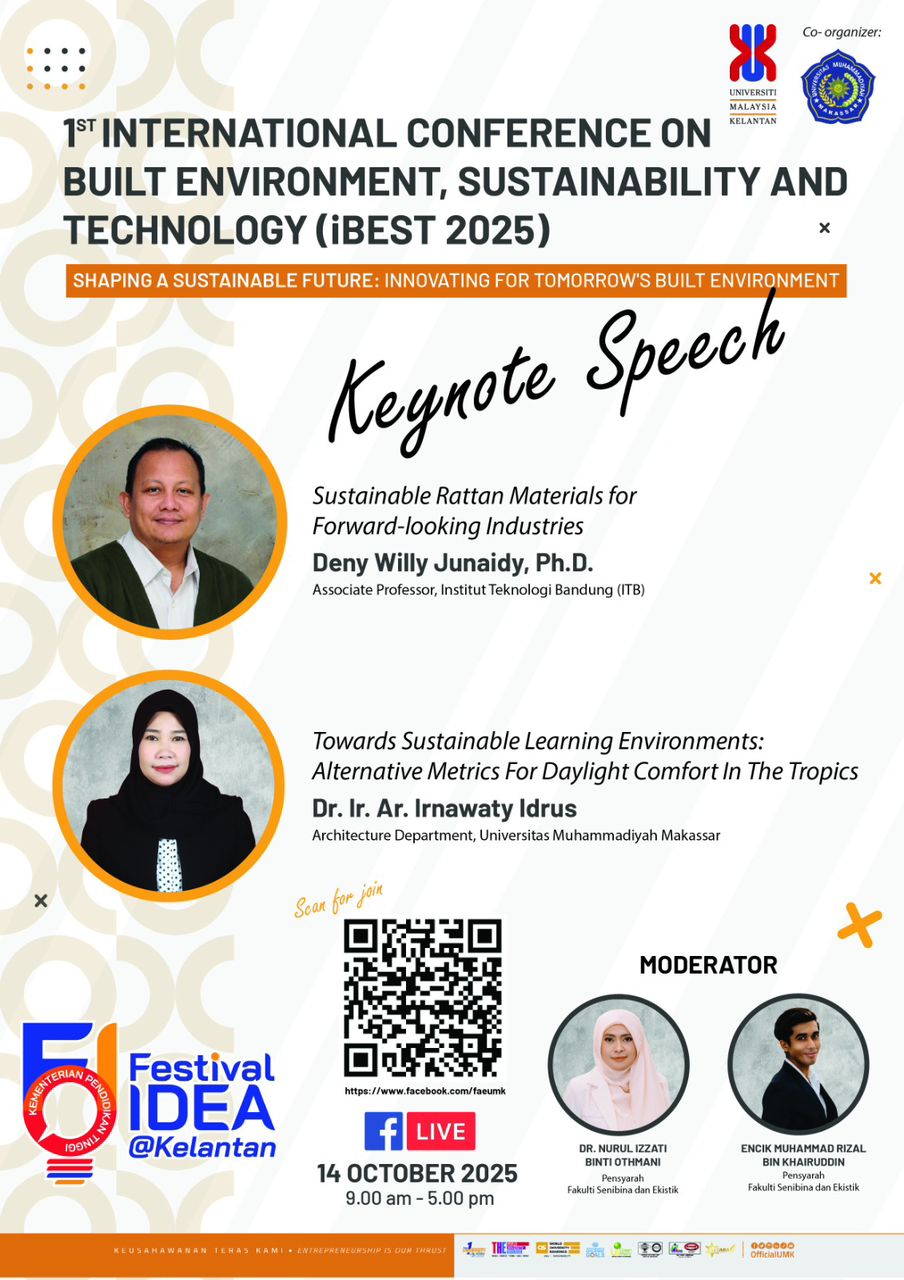 Konferensi iBEST 2025 menjadi bagian dari Festival IDEA @Kelantan, dan disiarkan secara live melalui Facebook pada tanggal 14 Oktober 2025, pukul 09.00–17.00 WIB, dengan moderator Dr. Nurul Izzati Binti Othmani dan Encik Muhammad Rizal Bin Khairuddin dari Fakultas Senibina dan Estetik UMK.