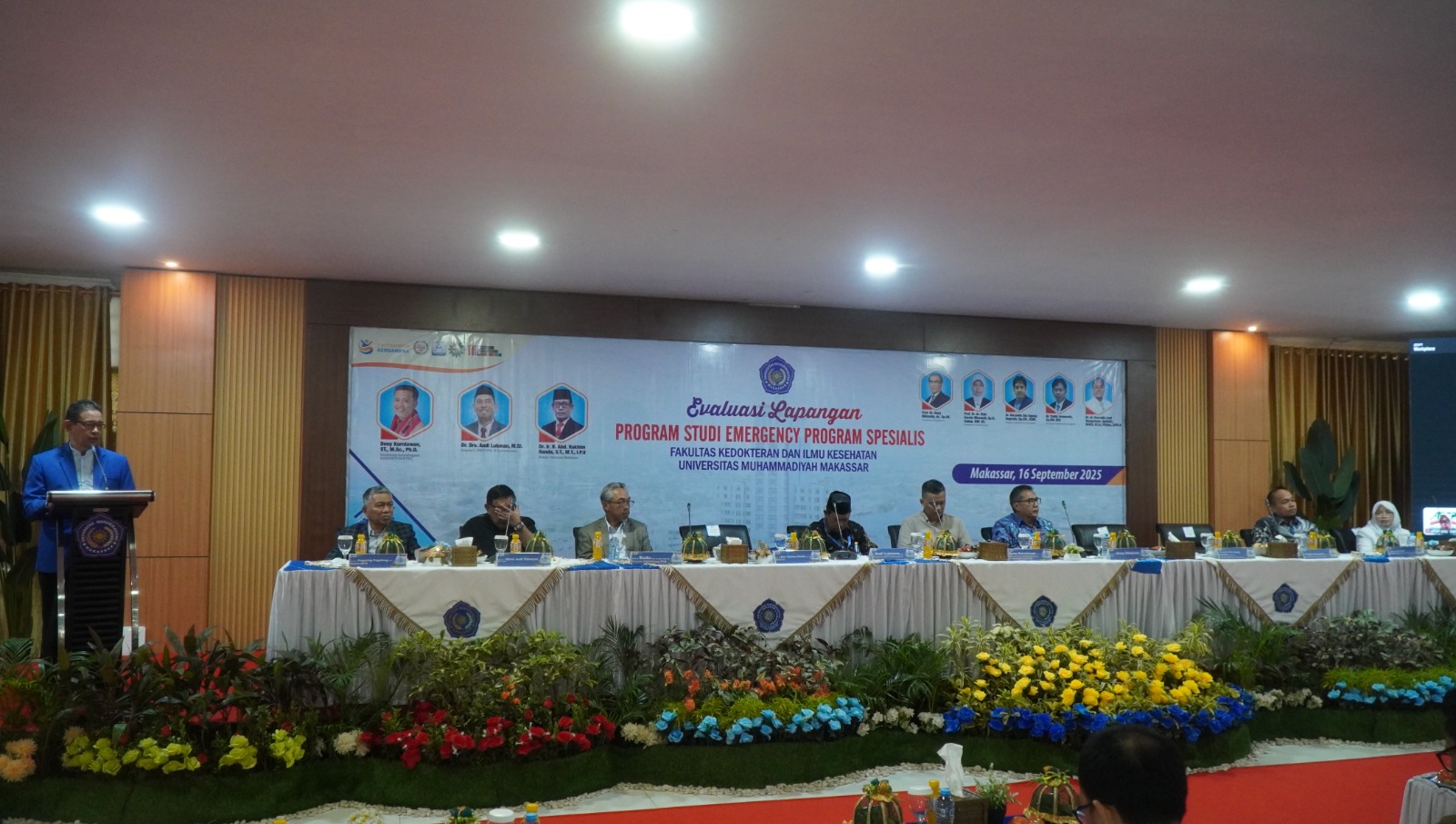 Tim evaluasi lapangan PPDS Emergency Unismuh Makassar menghadirkan jajaran asesor lintas lembaga, yaitu Deny Kurniawan – Direktorat Kelembagaan, Andi Lukman – Kepala LLDIKTI Wilayah IX, Dany Hilmanto – Universitas Padjadjaran, Diah Kurnia Mirawati – Universitas Sebelas Maret, Soetrisno – LAMPTKes, Arianti Anaya – KKI, Nasrudin Andi Mappaware – AIPKI, Andi Wahyuningsih – ARSPI, Eko Agung Nugroho – Kolegium Kedokteran Emergensi, Lingga Kresna Adiputra – Direktorat Kelembagaan, dan Abdul Rosid – Direktorat Kelembagaan.