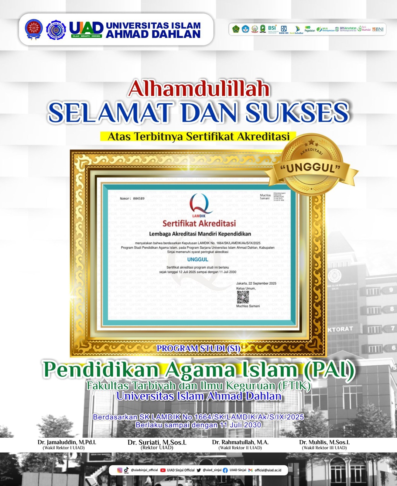 KHITTAH.CO, SINJAI — Kabar gembira dan membanggakan kembali datang dari Kampus Biru, sebutan untuk Universitas Islam Ahmad Dahlan (UIAD) Sinjai. Terbaru, Program Studi S1 Pendidikan Agama Islam (PAI) dengan Tag Line “Prodi Dunia Akhirat” Fakultas Tarbiyah dan Ilmu Keguruan (FTIK) resmi meraih Akreditasi Unggul dari Lembaga Akreditasi Mandiri Kependidikan (LAMDIK). Keputusan ini tertuang dalam SK […]