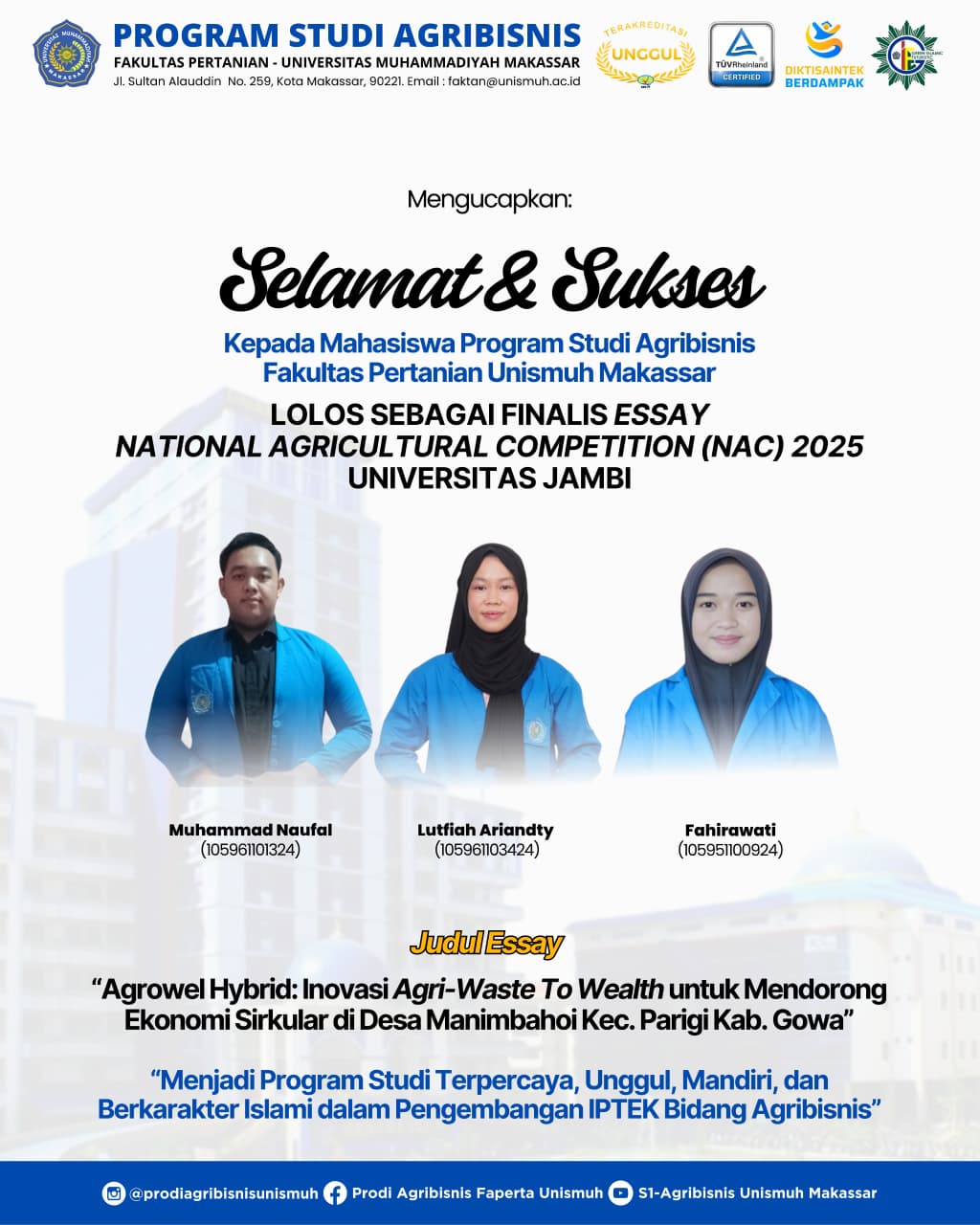 KHITTAH.CO, MAKASSAR – Tim mahasiswa Program Studi Agribisnis Universitas Muhammadiyah Makassar (Unismuh) meraih juara pertama Lomba Esai National Agricultural Competition Week FAPERTA Universitas Jambi (UNJA). Kemenangan ini diperoleh berkat gagasan inovatif berjudul “AGROWEL HYBRID,” yang berfokus pada pengolahan limbah pertanian dan rumah tangga (agri-waste) menjadi produk bernilai (wealth). Tim yang dipimpin oleh Muhammad Naufal, bersama […]