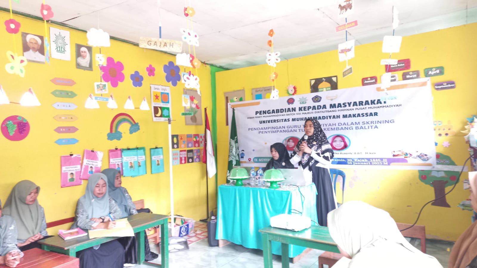Khittah.co, Makassar – Tim Pengabdian kepada Masyarakat (PKM) dari Program Studi Kebidanan Fakultas Kedokteran dan Ilmu Kesehatan (FKIK) Universitas Muhammadiyah (Unismuh) Makassar menggelar pendampingan bagi guru-guru TK Aisyiyah dalam melakukan skrining tumbuh kembang balita. Kegiatan ini berlangsung di TK Aisyiyah Barumbung, Kecamatan Matakali, Kabupaten Polewali Mandar, Sulawesi Barat, pada Kamis hingga Jumat, 30-31 Januari 2025.