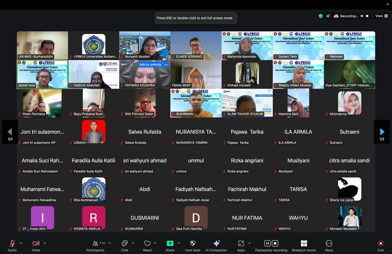 Kegiatan yang berlangsung secara daring melalui platform Zoom ini dimulai pukul 15.30 hingga 17.30 Wita, dan menjadi bagian dari kerja sama internasional yang difasilitasi oleh Lembaga Pengembangan Bahasa, Kerja Sama, dan Urusan Internasional (LPBKUI) Unismuh Makassar. Tujuan utama dari forum ini adalah memperkuat kolaborasi akademik antar perguruan tinggi di Asia Tenggara, khususnya dalam bidang tata kelola publik dan keterlibatan pemuda dalam demokrasi.